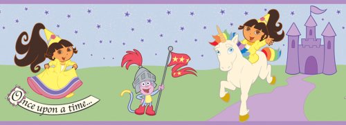 Your adorable pals from Nickelodeon frolic through these pre-pasted wall accents. Bright and colorful, these 6-inch and 9-inch wall borders come 12-feet long and make a perfect accent wall. Easy to install, just wet and apply to any flat dry surface. The product's vinyl surface cleans quickly with simple soap and water. Bring home all these Nickelodeon Wall Accents to help decorate your kid's room. Coordinated murals, head board appliqués, Growth charts and borders sold separately..../ Brewster 147B67103 Nickelodeon Dora Princess Wall Border / Dora Beds